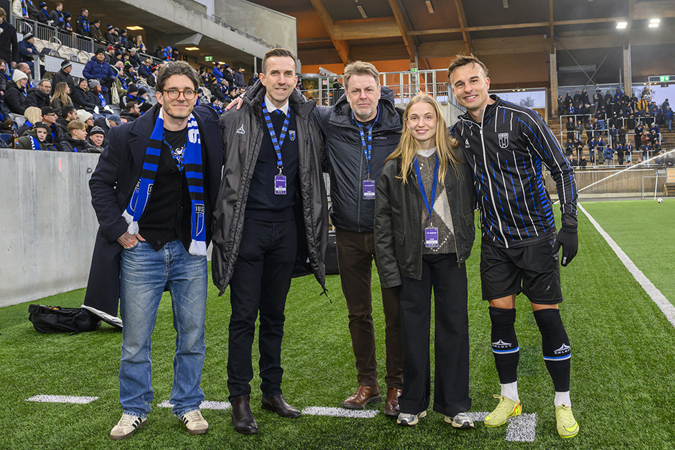 Fr.v. Ian Sirenius, Projektledare Gränslös fotboll. Martin Malmberg, klubbdirektör Sirius Fotboll. Pär Karlsson, VD ByggConstruct. Malin Forssner, Sirius Dam. Henrik Rönnlöv Castegren, Sirius Herr.
