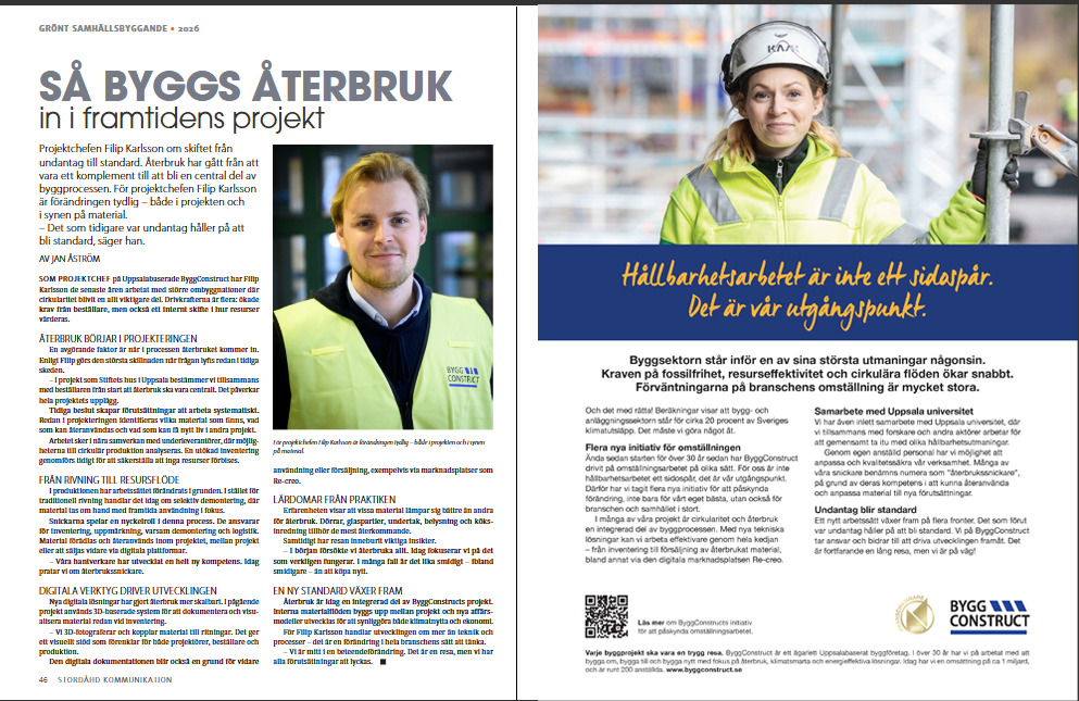 När återbruk görs på rätt sätt skapar det värde på riktigt. På ByggConstruct är det en naturlig del av hur vi driver och utvecklar våra projekt. Ett tydligt exempel är Filip Karlsson, projektchef på ByggConstruct som nyligen uppmärksammats i tidningen "Grön samhällsbyggare", och som visar hur kunskap och engagemang kan omsättas i praktiken.